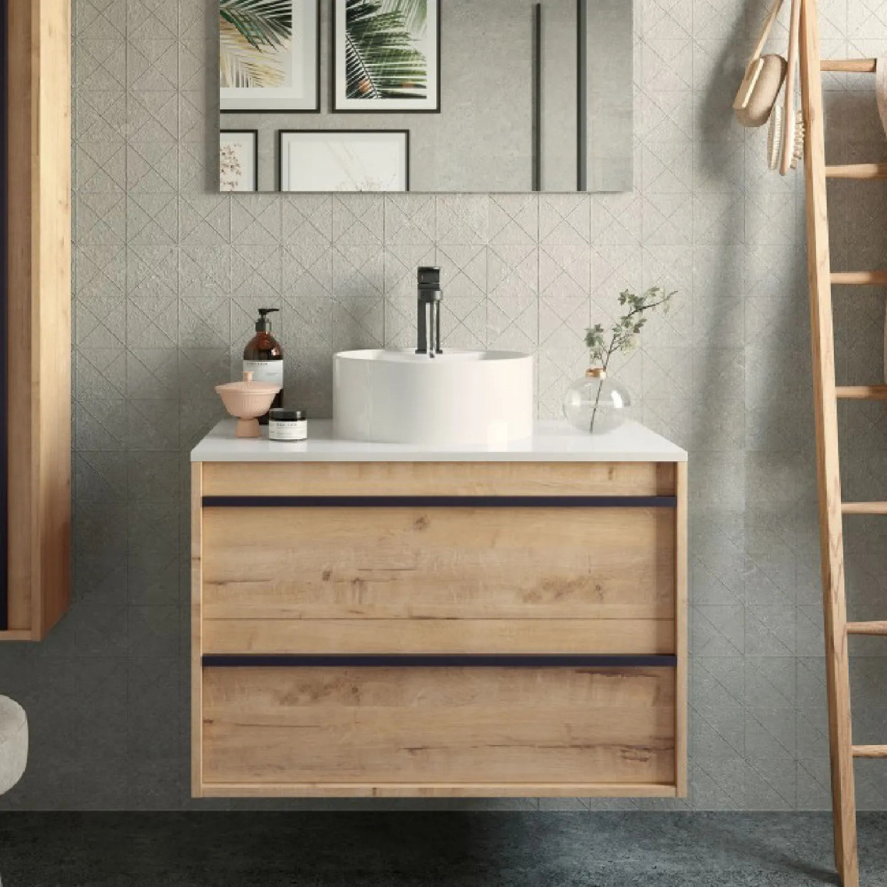 Meglioalge presenta il mobile bagno sospeso 80 cm in rovere ostippo con lavabo Atelier. Eleganza e funzionalità unite in un design raffinato. In pronta consegna!